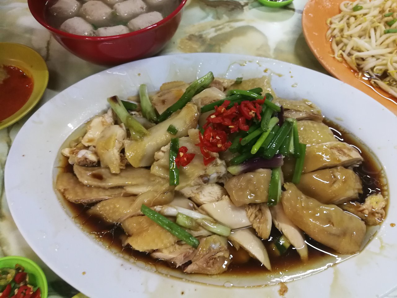 Ayam Taugeh juga merupakan makanan cina yang popular dan ikonik di bandar Ipoh. Makanan popular ini juga boleh didapati di restoran halal di sekitar Ipoh.